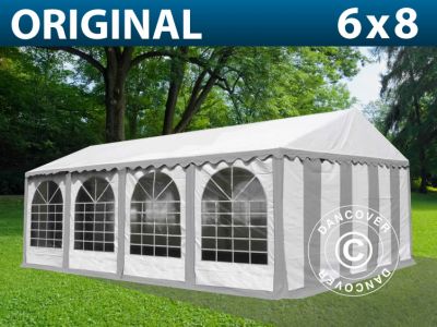- Oferta con IVA : EUR 748,14 Datos del producto - Popular carpa para fiestas 6 x 8 m - Alternativa de precio razonable a las carpas de alquiler profesionales - Color gris/blanco - Tela de techo resistente, ignífuga, impermeable de PVC 500 gr./m² - Piezas laterales resistentes, ignífugas, impermeables de PVC 400 gr./m² - Ventanas rústicas en ambos lados longitudinales para buena luminosidad - Los lados vienen a secciones de 2 metros con ventanas - Entrada en ambos extremos de fachada - Armazón de acero galvanizado de 38 mm y 42 mm - Se suministran armazón de fundamento y picas de tierra para mayor estabilidad - Montaje fácil con tornillos de mariposa - Altura lateral: 2 m - Altura de caballete: 3,05 m http://www.dancovershop.es Tel.: 911 436 828