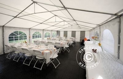 - Carpa para fiestas en calidad resistente con tela de PVC robusto, y armazón de acero galvanizado de 38/42 mm. Color gris/blanco Datos del producto - Carpa para fiestas Plus 6x12 m PVC - Alternativa de precio razonable a las carpas de alquiler profesionales - Color: gris/blanco - Tela de techo resistente, ignífuga, resistente al fuego, impermeable de PVC 500 gr./m² - Piezas laterales resistentes, ignífugas, resistente al fuego, impermeables de PVC 500 gr./m² - La tela PVC ha sido probada según: M2, B1/B2 y DIN 4102 - Los lados vienen a secciones de 2 metros con ventanas - Ventanas rústicas en ambos lados longitudinales para buena luminosidad - Entrada en ambos extremos de fachada - Armazón de acero galvanizado (38/42 mm) - Se suministran armazón de fundamento y picas de tierra para mayor estabilidad - Montaje fácil con tornillos de mariposa - Peso: 388 kg - Altura lateral: 2 m - Altura de caballete: 3,05 m