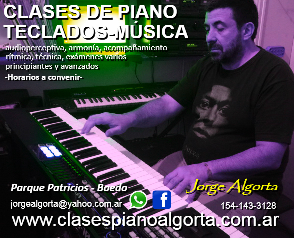 - Clases de piano, teclados, órgano, audioperceptiva, armonía, rítmica, técnicas de acompañamiento, exámenes varios. Gran experiencia en todos los niveles y edades, clases individuales en estudio. Música académica y popular. Horarios a convenir. Parque Patricios-Boedo, Buenos Aires, Argentina Jorge Algorta Tel/Whatsapp: 1541433128 jorgealgorta@yahoo.com.ar www.clasespianoalgorta.com.ar https://www.facebook.com/CLASES-DE-PIANO-TECLADOS-Y-MUSICA-Jorge-Algorta