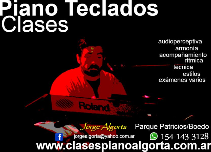 - Clases de piano, teclados, órgano, audioperceptiva, armonía, rítmica, técnicas de acompañamiento, exámenes varios, coach. Gran experiencia en todos los niveles y edades, clases individuales en estudio. Música académica y popular. Horarios a convenir. Parque Patricios-Boedo, Buenos Aires, Argentina Jorge Algorta Tel/Whatsapp: 1541433128 jorgealgorta@yahoo.com.ar www.clasespianoalgorta.com.ar https://www.facebook.com/CLASES-DE-PIANO-TECLADOS-Y-MUSICA-Jorge-Algorta