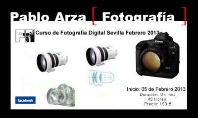 - Curso de Fotografía Digital Sevilla Febrero 2013 Este Curso está dirigido a todas aquellas personas que deseen aprender desde las técnicas básicas, hasta los elementos más complejos como la iluminación - el sistema de zonas y la fotometría. Impartido por el fotógrafo profesional Pablo Arza Tismon Inicio del Curso: 05 de Febrero. Final: 12 de Marzo de 2013. Días de clase: Martes y jueves de 20: 00 a 22: 00 horas, 20 horas teóricas y 20 horas práticas. Total 40 horas + info: fotografodesevilla.com y pabloarza.net