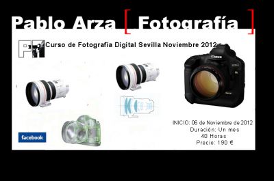 - Curso de Fotografía Digital Sevilla Noviembre 2012 Este Curso está dirigido a todas aquellas personas que deseen aprender desde las técnicas básicas, hasta los elementos más complejos como la iluminación - el sistema de zonas y la fotometría. Impartido por el fotógrafo profesional Pablo Arza Tismon. Inicio del Curso: 06 de Noviembre. Final: 11 de Diciembre 2012. Días de clase: Martes y jueves de 20:00 a 22:00 horas, 20 horas teóricas y 20 horas práticas. Total 40 horas + info: www.fotografodesevilla.com - www.pabloarza.net