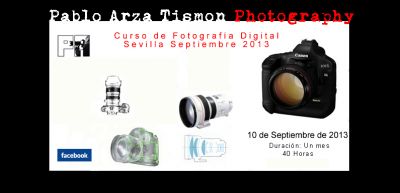 - Curso de Fotografía Digital Sevilla Septiembre 2013 Este curso está dirigido a todas aquellas personas que deseen aprender, desde las técnicas básicas, hasta los elementos más complejos, como la iluminación, el sistema de zonas y la fotometría. Impartido por el fotógrafo profesional Pablo Arza Tismon. Inicio del curso: 10 de Septiembre. Final: 10 de Octubre de 2013 Días de clase: Martes y Jueves de 20:00 a 22:00 horas y Salidas de campo: durante dos domingos (prácticas) + Información: www.fotografodesevilla.com y www.pabloarza.net