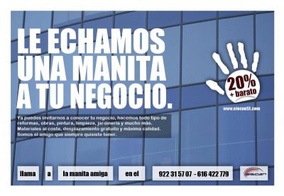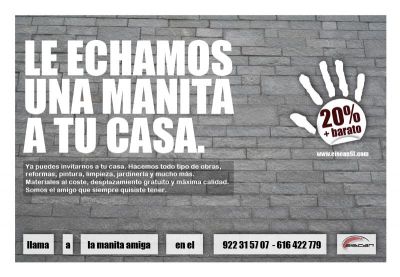 - Hacemos obras, reformas, rehabilitación de fachadas, pinturas, servicios de limpieza, piscina, jardinería y mucho más. Materiales al coste, desplazamiento gratuito y máxima calidad. Ofrecemos 2 años de Garantía en todos nuestro trabajos. Somos el amigo manitas que siempre quisiste tener. Pide tu presupuesto a través de facebook, www.eiscansl.com o llamando al 922 315707 Recuerda que a nuestros amigos le descontamos un 20%