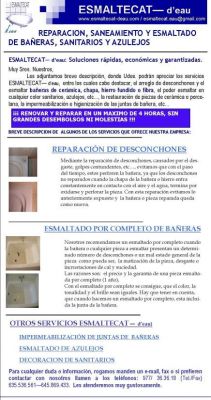 - ESMALTECAT- d’eau: Viene desarrollando desde hace años sus servicios, entre los cuales cabe destacar, el arreglo de desconchones y el esmaltar bañeras de cerámica, chapa, hierro fundido o fibra, el poder esmaltar en cualquier color sanitarios, azulejos, etc..., la restauración de piezas de cerámica o porcelana, la impermeabilización e higienización de las juntas de bañera, etc.. Para cualquier duda o información, rogamos pónganse en contacto con nosotros vía e-mail, fax/tel. (CENTRAL) 977/ 36.36.18 o si prefieren contactar con nosotros llamen a los teléfonos 635.536.561 o 645.869.433. Les atenderemos muy gustosamente. WEB: www.esmaltecat-deau.com E-MAIL: info@esmaltecat-deau.com