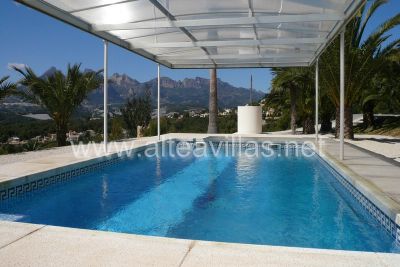 - La Villa de lujo está ubicada muy tranquila y tiene propio helipuerto. Hay vistas al mar y las montañas preciosas. La villa tiene un salon-comedor con mirador, 5 dormitorios, 3 cuartos de baño, un aseo, una espaciosa cocina equipada y un domestico. Hay calefacción central de aceite, aire acondicionado, sistema de alarma, preinstalación para un ascensor, agua de fuente, una nave con generador de diésel, un garaje para 4 coches, un depósito de agua de 100.000 l, una cámara frigorífica, un mueble-bar profesional y una sauna. La piscina con cobertura automatica tiene 10 x 5 m y una ducha exterior. Hay una tasación de marzo 2009 de 3.811.277,- Euros. Altea Villas Telf. 96 584 72 12 - 606 073 355 Email: service@alteavillas.net www.alteavillas.net Ref. V-ALT19