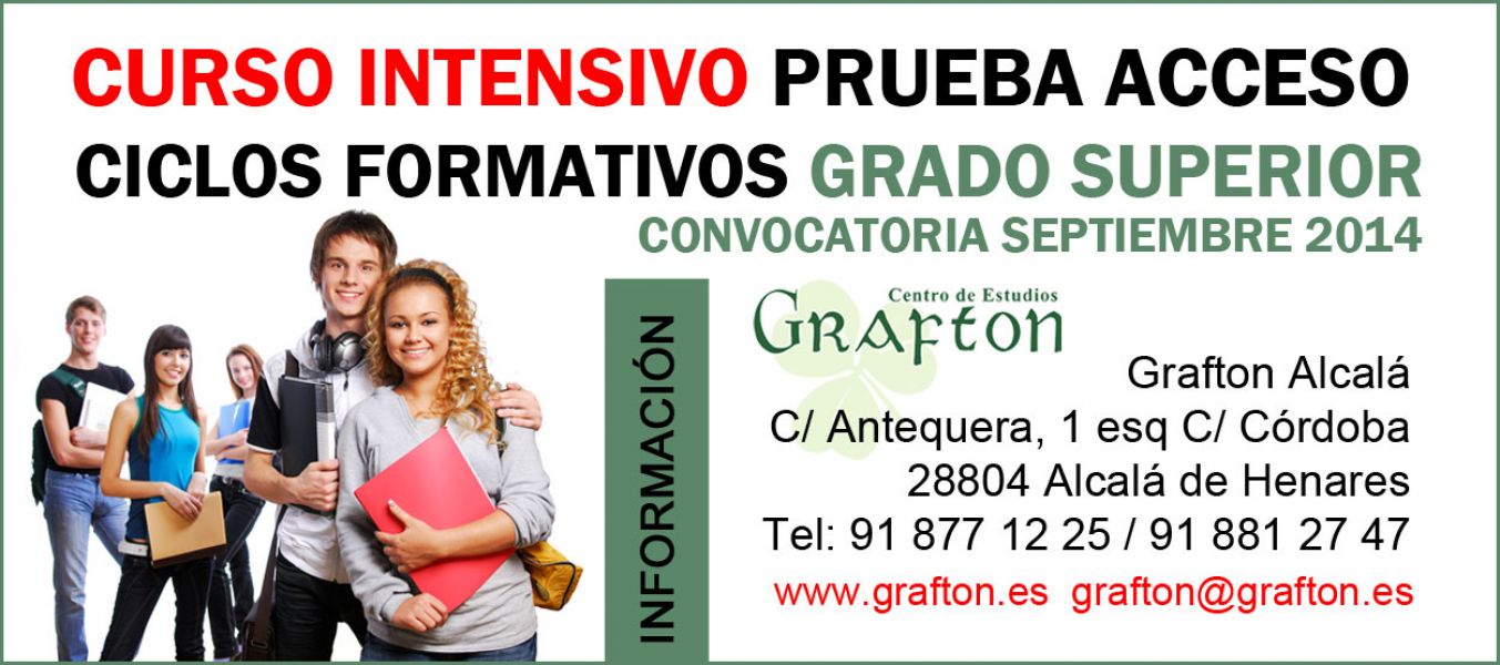 - Si has realizado este año un ciclo formativo de grado medio en Madrid y quieres presentarte a la prueba de acceso a un ciclo de grado superior en septiembre o te quieres presentar por Castilla La Mancha, en nuestro centro te preparamos para que apruebes. Impartimos las tres asignaturas comunes: lengua, inglés y matemáticas en horario de mañana o tarde durante los meses de julio y agosto. Contamos con amplia experiencia en la preparación de la prueba y con profesores titulados y altamente cualificados. Si estás pensando en presentarte, no te lo pienses e infórmate en nuestro centro. Grafton Alcalá C/ Antequera, 1 Alcalá de Henares Tel: 91 877 12 25