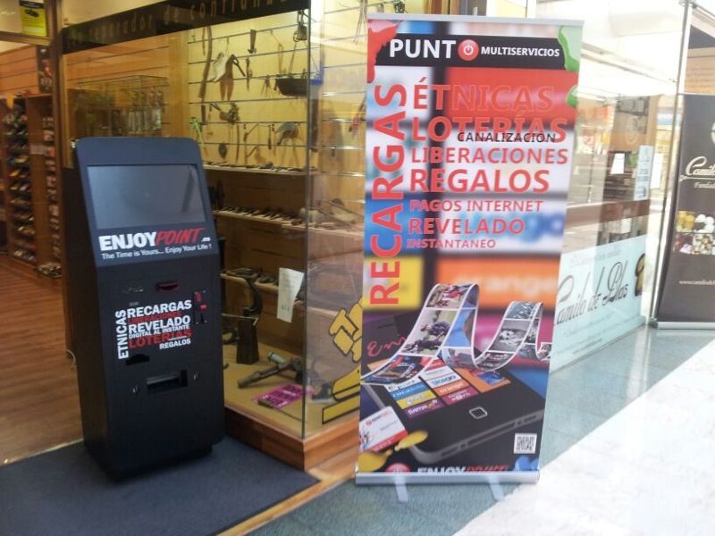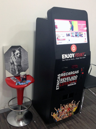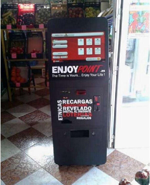 - Ocupando sólo 54x56 cm, podrá ofrecer a sus clientes, las 24h, una amplia variedad de servicios a través de esta máquina vending, como Canalización de loterías y Apuestas del Estado, Impresión de fotos, Telefonía (recargas, tarjetas étnicas, liberalización de móviles), Pines, consolas y juegos, Música y Tv, Software, central de compras y regalos personalizados, Medios de pago (Paysafecard, Ukash)… Financiada o al contado. Indíquenos su telf. y provincia al responder, por favor. www.enjoypoint.es