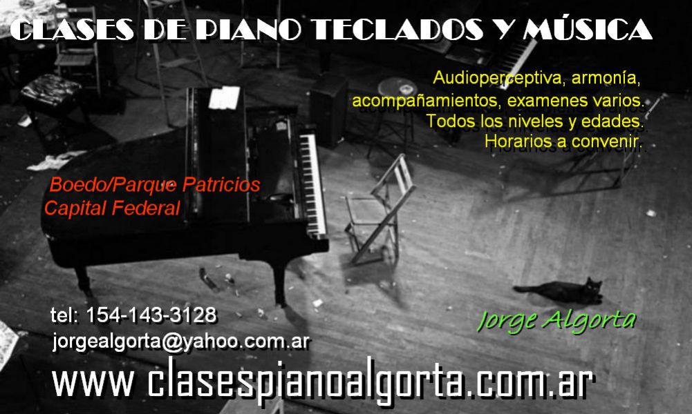 - Clases de piano, teclados, órgano, audioperceptiva, armonía, técnicas de acompañamiento, exámenes varios. Gran experiencia en todos los niveles y edades, clases individuales en estudio. Música académica y popular. Horarios a convenir. Buenos Aires, Argentina Jorge Algorta Tel: 1541433128 jorgealgorta@yahoo.com.ar https://www.facebook.com/CLASES-DE-PIANO-TECLADOS-Y-MUSICA-Jorge-Algorta