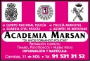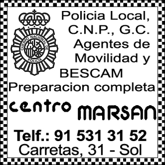 - Academia Marsan (91 5313152), prepara todas las pruebas de ingreso en el Cuerpo Nacional de Policía - escala básica: - Horarios: lunes, miércoles y viernes - temario y psicotécnicos: mañana: 12 a 14 h. - tarde: 16'30 a 18'30 h. - noche: 20 a 22 h. martes y jueves - pruebas físicas: de 17 a 18'30 h. polideportivo concepción (quintana) - profesorado formado por funcionarios del cuerpo y licenciados universitarios. - grupos reducidos (máx. 20 alumnos/aula).atención personalizada y seguimiento de progresos en la preparación de cada alumno. - buen nivel de aprobados en cada convocatoria. - Precio de la preparación del ingreso en cuerpo nal. de policía: - Matrícula: 90 euros se abona al formalizar la inscripción, incluye temario y material - cuota mensual: 105 euros, todo incluido. Se paga mes a mes y no hay compromiso de permanencia ni contrato. INFORMACIÓN Y MATRÍCULA: Academia Marsan - Telf.: 91 5313152 - Carretas, 31 (SOL)- 28012 MADRID