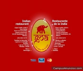 - . Claro que no. El restaurante GOA ® despertará también tu gusto por la exótica y deliciosa comida de la India en un ambiente informal, pero muy agradable. GOA ®... un sabor de la India López Cotilla 1520-A (a dos cuadras del Consulado de Estados Unidos, entre Marsella y Chapultepec) Colonia Americana 44140 Guadalajara, Jal. México (33) 3615 6173 Martes a sábado: 13 a 24 h Domingo: 13 a 19.30 h Lunes: cerrado MasterCard, Visa y Visa Electron Para ver menú y bebidas, favor de copiar y pegar: [URL]http://www.goa-restaurantes-guadalajara.com[/URL] .
