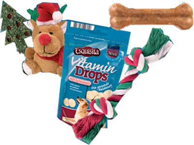 - Es perfecta para regalar a tu perro o a los de tus amigos. Contiene juguetes y golosinas deliciosas. En el interior de la caja puedes encontrar: 1 bolsa de Drops Chocolate de 75 g. 1 hueso masticable, 100% piel, aprox. 35 g y 11 cm. 1 snack de árbol de Navidad Munchy. 1 juguete de peluche de 15 cm. 1 Mordedor de cuerda de 70 gr/20cm