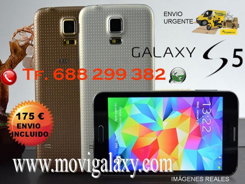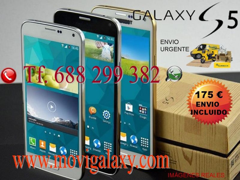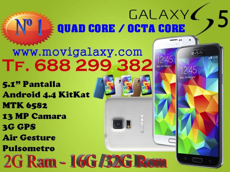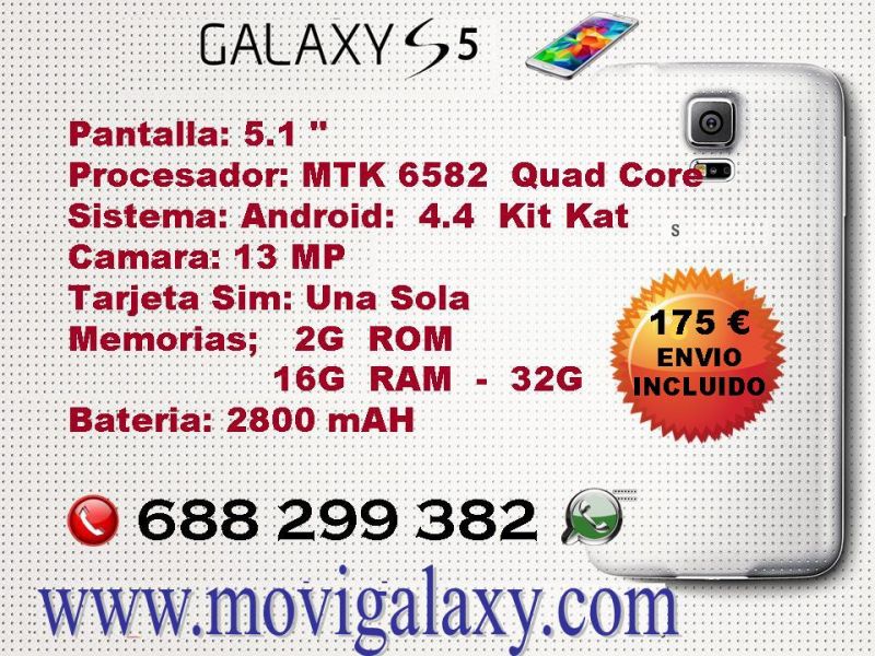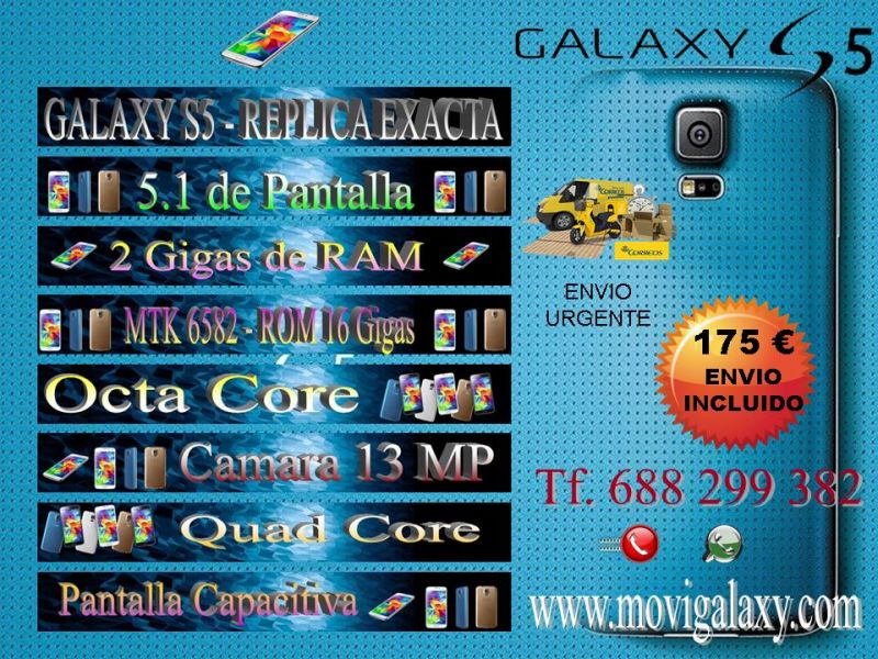 - La mejor replica del galaxy s5; logos originales, pantalla 5.1 , Octa Core/Quad Core, MTK6589, 2G RAM, 32G ROM, 32G SD Total 64G de almacenamiento, Camara 13 MP con flash adelante y 5 MP atras, Unica SIM, Sistema Android 4. 4 KitKat, Bateria 2800mAh, Seguridad de la Huella dactilar, todas las aplicaciones; Atiendo Wassap, telefono, entrega en mano barcelona, envios a toda españa contrareembolso, visita nuestra web: Tf. 688 299 382 www.movigalaxy.com