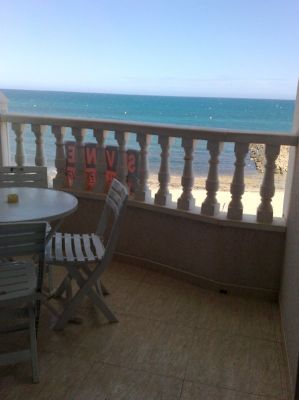 • Torrevieja, Primera línea de playa de los locos. Apartamento de dos dormitorios. Seminuevo. Amueblado y equipado. Terraza. Vistas frontales al mar. Piscina comunitaria. Cerca de todos los servicios. 132.000 €.