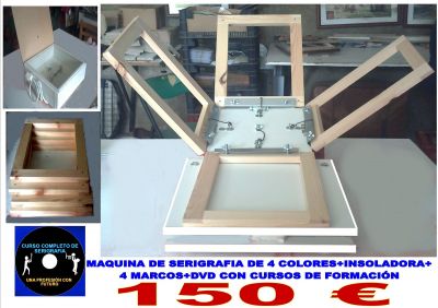 - kit completo compuesto de maquina de serigrafia de 4 colores medidas de 45 x 60,plataforma de serigrafiado 40 x 40 ctros,+ insoladora con 1 alogeno de 500 watios,medidas 30 x 30 x 10 ctros + DVD con cursos de serigrafia+ 4 marcos,medidas 30 x 40 ctros por solo 150 euros + 20 euros de gastos de envío,la pagas cuando la agencia te entregue el Equipo,esta maquina lleva un sistema giratorio basculante con estabilizador y anclaje del marco para cada color,Esta oferta sera por tiempo limitado(Toda España)