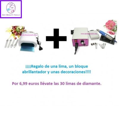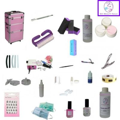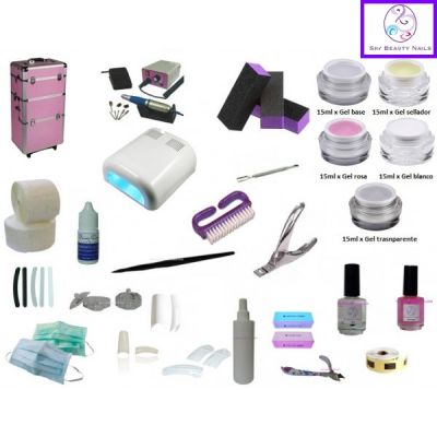 - KIT DE GEL PROFESIONAL CON TROLLEY. 1 x Lámpara de uñas. 1 x Torno de uñas 30.000 rpm. 1 x Maleta grande troley rosa (totalmente equipada para introducir todos tus productos, lámpara torno y accesorios de uñas). 2 x Buffer quitarralladuras. 2 x Abrillantadores. 2 x Lima banana negra. 1 x Lima recta fina negra. 1 x Lima banana blanca. 1 x Lima recta blanca. 1 x Gel base Sky Beauty Nails 15 ml. 1 x Gel rosa Sky Beauty Nails 15 ml. 1 X Gel blanco Sky Beauty Nails 15 ml. 1 x Gel sellador Sky Beauty Nails 15 ml. 1 x Desinfectante en spray con vaporizador. 1 x Primer. 1 x Aceite de cutículas 15 ml. 1 x Caja tips uñas color blanco. 1 x Caja tips uñas color trasnparente. 1 x Caja tips uñas color natural. 2 x Pegamento uñas. 1 x Empujador metálico uñas. 100 x Toallitas celulosa. 1 x Pincel uñas gel. 1 x Cortatips. 100 x Moldes adhesivos. 3 x Vasitos godette cristal tapa. 1 x Limpia partículas. 1 x Limpiador pincel. 1 x Decoraciones en pegatinas. 1 x Alicates rel