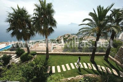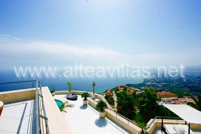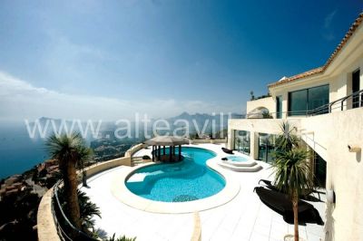 - Esta maravillosa villa aislada con apartamento separado esta ubicada en la urbanización famosa Altea Hills en situación privilegiado. Las vistas al mar y panoramicas a la bahía de Altea y a la Sierra Bernia son espectaculares. La parcela tiene aproximadamente 1.216 m² y la superficie tiene aproximadamente 700 m². La villa consta de un salon amplio, comedor, 4 dormitorios, 4 cuartos de baño, aseo, cocina equipada con la última tecnología, gimnasio, y bodega. El dormitorio principal tiene bañera de hidromasaje y terraza propia. Hay sistema de alarma, cristales de seguridad Climalit, ascensor, persianas automáticas en todos los dormitorios y calefacción por suelo radiante. En el exterior hay un jardín pintoresco, parking para 6 coches, barbacoa, una piscina climatizada con sistema de electrolisis salina y con zona bar, jacuzzi así como terrazas. Altea Villas Telf. 96 584 72 12 - 606 073 355 Email: service@alteavillas.net www.alteavillas.net