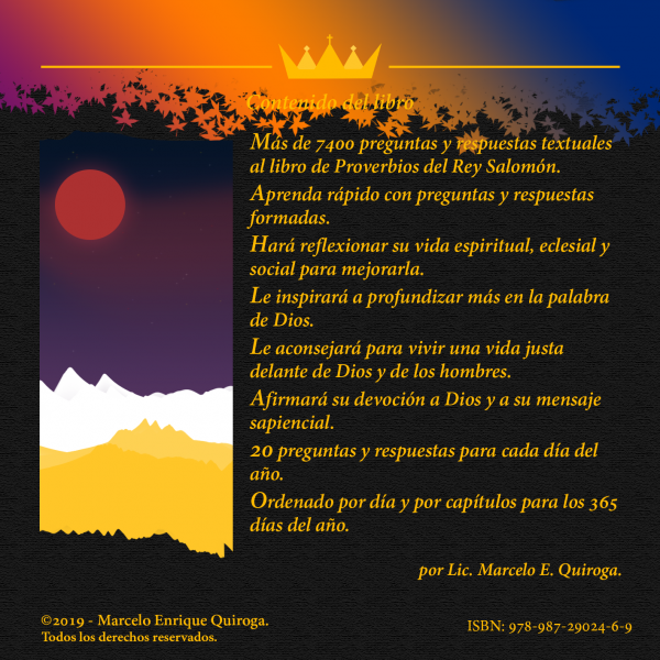 - 🡢 Más de 7400 preguntas y respuestas textuales al libro de Proverbios del Rey Salomón. 🡢 Aprenda rápido con preguntas y respuestas formadas. 🡢 Hará reflexionar su vida espiritual, eclesial y social para mejorarla. 🡢 Le inspirará a profundizar más en la palabra de Dios. 🡢 Le aconsejará para vivir una vida justa delante de Dios y de los hombres. 🡢 Afirmará su devoción a Dios y a su mensaje sapiencial. 🡢 20 preguntas y respuestas para cada día del año. 🡢 Ordenado por día y por capítulos para los 365 días del año. Por Lic. Marcelo E. Quiroga Web: ProverbiosPyR.webnode.es proverbiospyr@gmail.com Precios: 300 ARS 5.99 USD 5.44 EUR